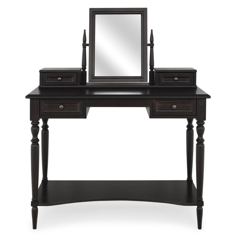Masă de toaletă Chocolate. Gama Chocolate se poate integra cu succes în spații pline de eleganță, datorită aspectului său deosebit, accentuând bunul gust al locului. Masa din gama Chocolate este rezultatul clasicului francez fără vârstă, combinat cu un finisaj aspectuos. Realizată în linii clasice și decorată cu detalii fine, aceasta oferă posibilitatea de a depozita diverse produse cosmetice sau lucrurile necesare și este completată de o oglindă, pentru un plus de funcționalitate. Cromatica este sobră, aducând decorului un aer rafinat.