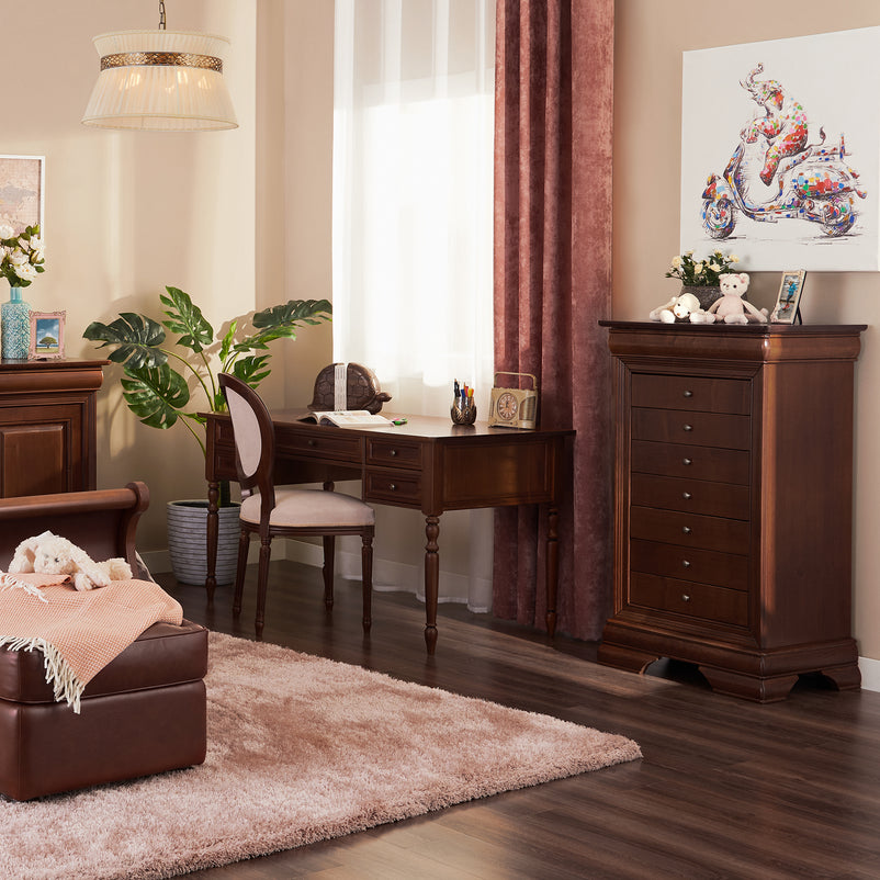Comodă 7 sertare Louis Philippe. Gama Louis Philippe transformă căminul vostru într-o simfonie dedicată clasicului francez. Comoda din gama Louis Philippe este o piesă de mobilier plină de eleganță, grație elementelor ce o definesc. Aceasta este prevăzută cu 7 sertare și vă oferă spații generoase pentru depozitarea diferitelor obiecte într-un mod organizat. În plus, puteți așeza decorațiunile preferate deasupra comodei. De asemenea, cromatica este deosebită, aducând decorului un aer nobil.