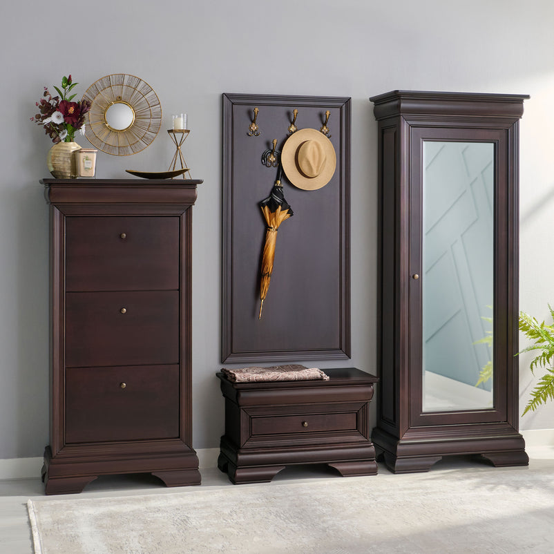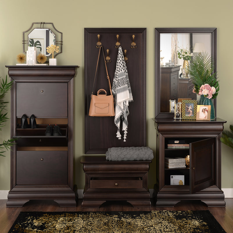 Cuier hol Chocolate. Gama Chocolate se poate integra cu succes în spații pline de eleganță, datorită aspectului său deosebit, accentuând bunul gust al locului. Cuierul din gama Chocolate este rezultatul clasicului francez fără vârstă, combinat cu un finisaj aspectuos. Realizat în linii clasice și decorat cu detalii fine, acesta este prevăzut cu agățătoare, care vă oferă posibilitatea de a așeza hainele într-un cuier practic și estetic. Cromatica este sobră, aducând decorului un aer rafinat.