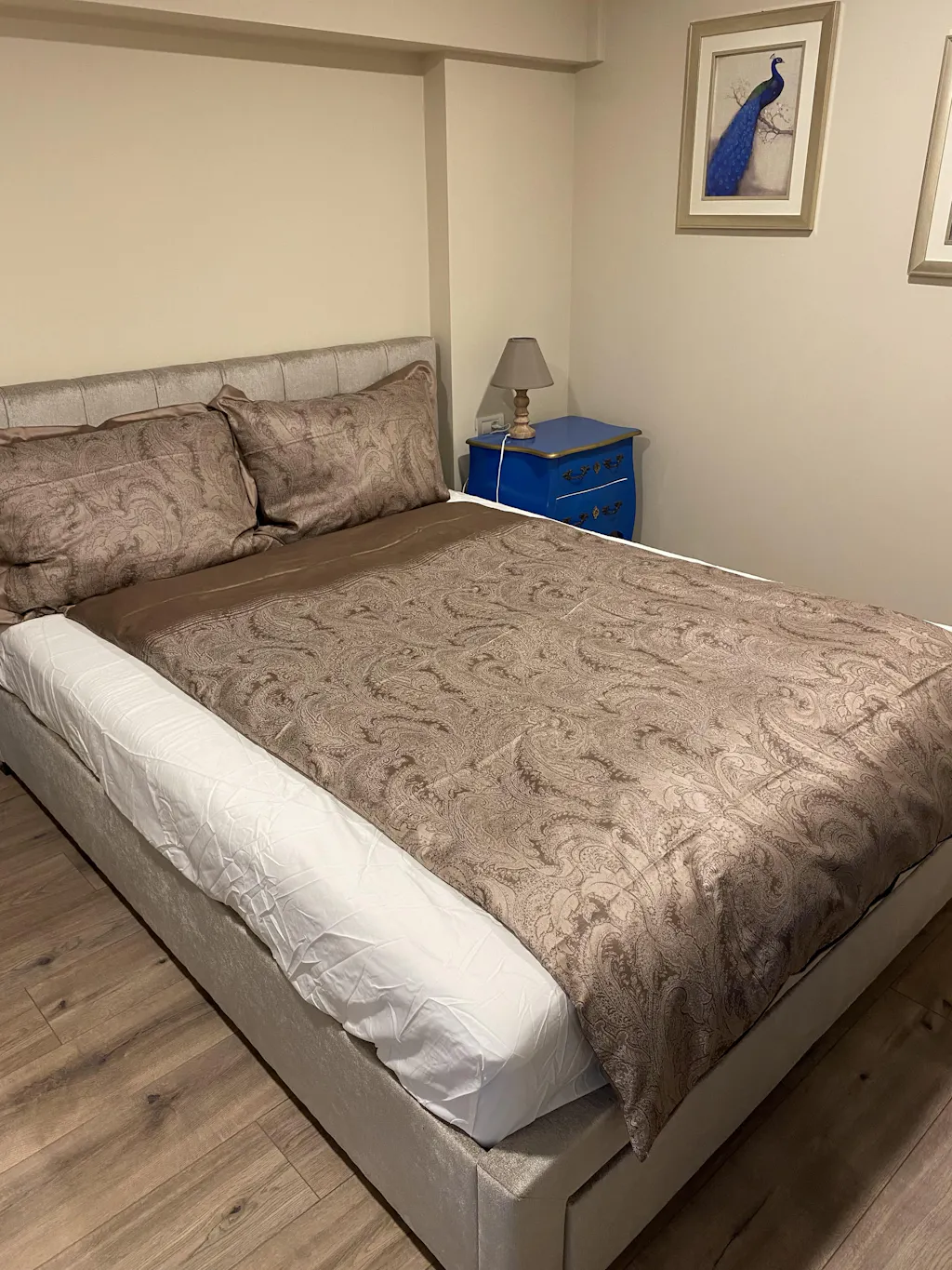 Patul tapițat Noria aduce un aspect estetic deosebit, cu o tapițerie de calitate în tonuri neutre și detalii discrete care completează armonios atmosfera camerei.
