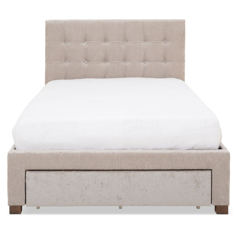 Pat tapițat, somieră și sertar incluse Noria. Cu un design modern, patul din gama Noria contribuie la amenajarea unui dormitor confortabil și primitor, pregătit să ofere momente de relaxare deplină. Patul are o structură din lemn masiv și panouri aglomerate din lemn, iar designul este pus în valoare de stofa bej și de cadrul subliniat de butonii decorativi din tapițeria acestuia, pentru un aspect vizual deosebit de estetic și îmbietor. Are inclus un sertar încăpător care salvează spațiul prin organizarea eficientă a lucrurilor necesare.