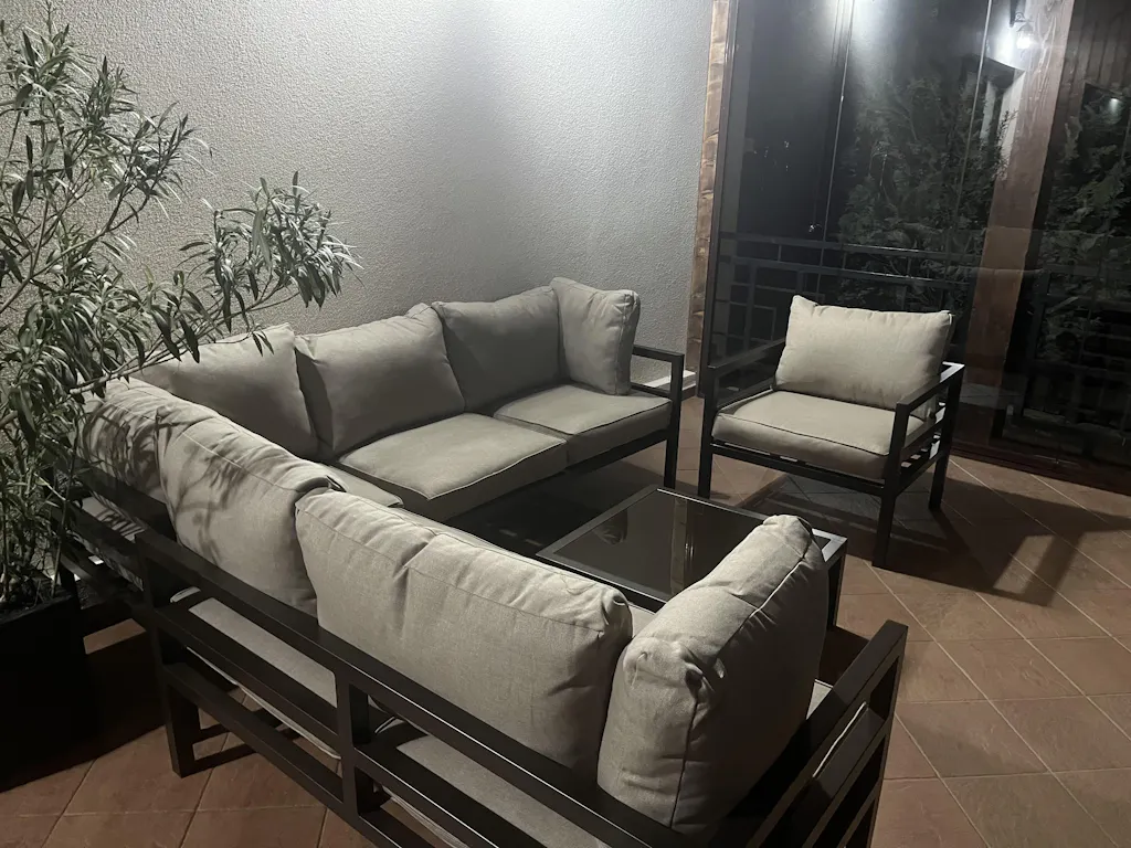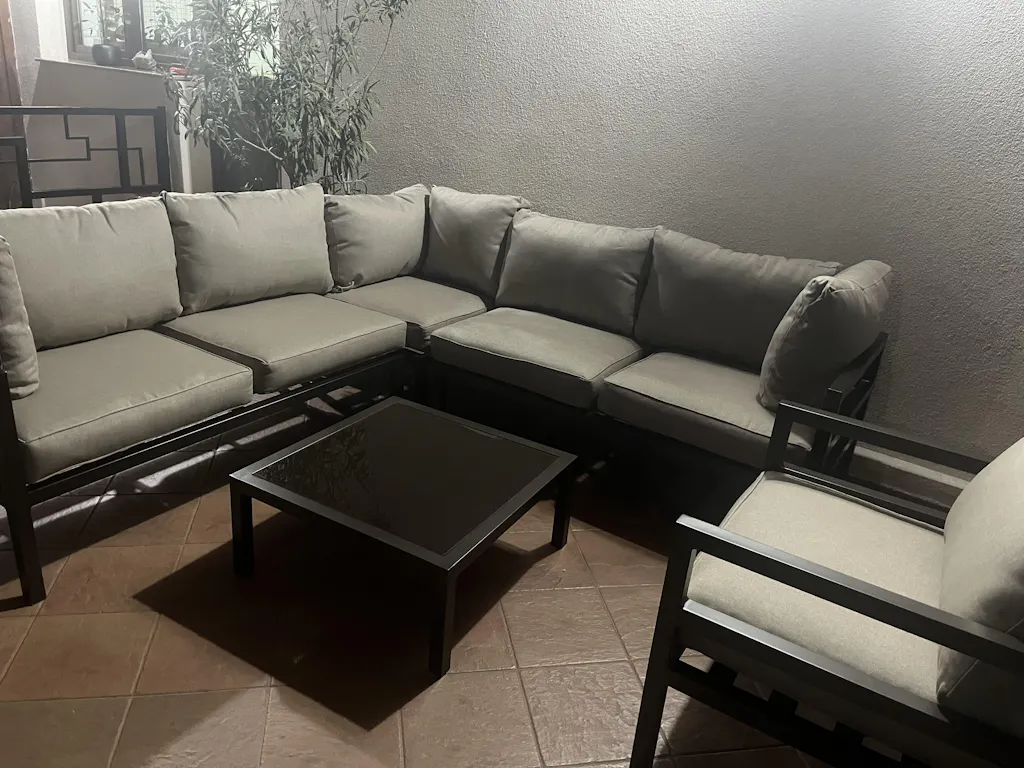 Mobilier pentru terasă și gradină Madrid. Atunci când temperaturile plăcute de afară parcă nu vă lasă sa intrați în casă pentru a servi masa sau a bea o cafea, piesele din colecția Madrid vă sar în ajutor. Cu ajutorul acestora, vă puteți organiza un nou living și/sau dining de vară chiar în cadrul terasei sau grădinii voastre. Ele sunt realizate pe o structură din aluminiu vopsită în câmp electrostatic, rezistentă la rugină. Pernele ce acoperă colțarul sunt fabricate din poliuretan și vată siliconată, îmbrăcate în poliester impermeabil, cu protecție UV. Masa este acoperită cu o sticlă securizată de 5 mm.