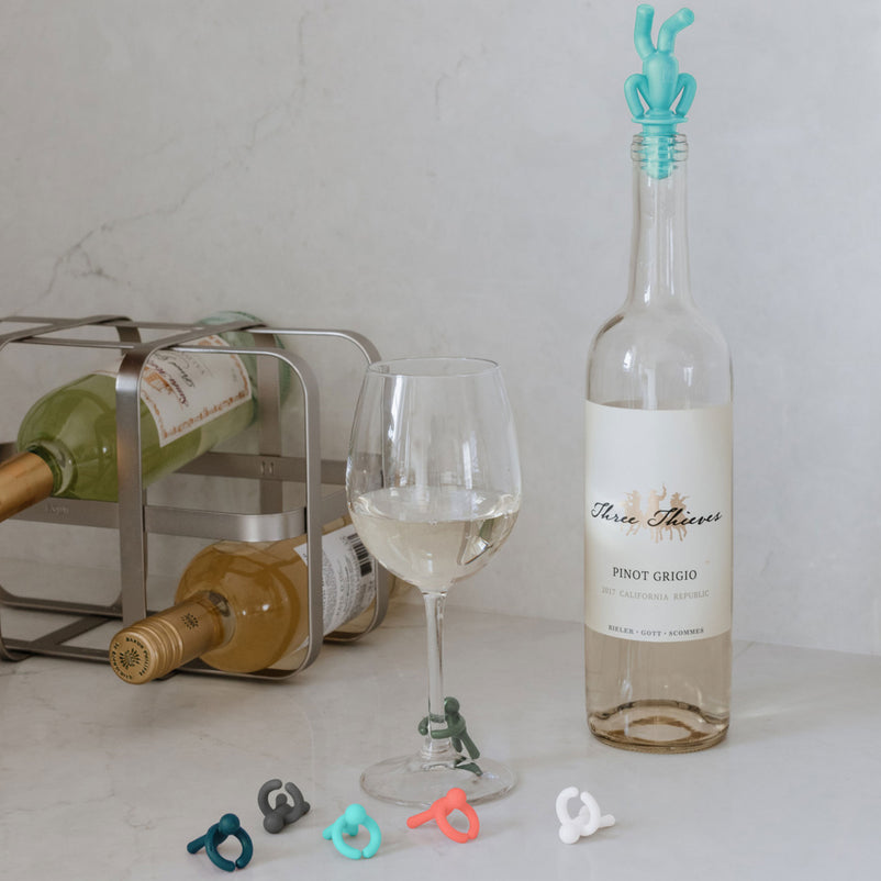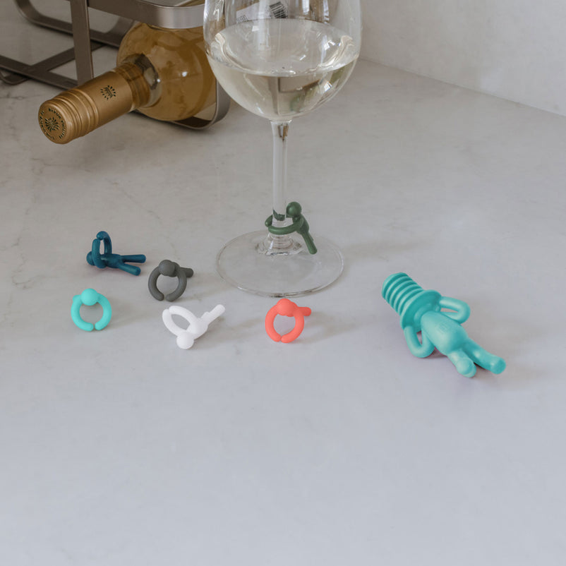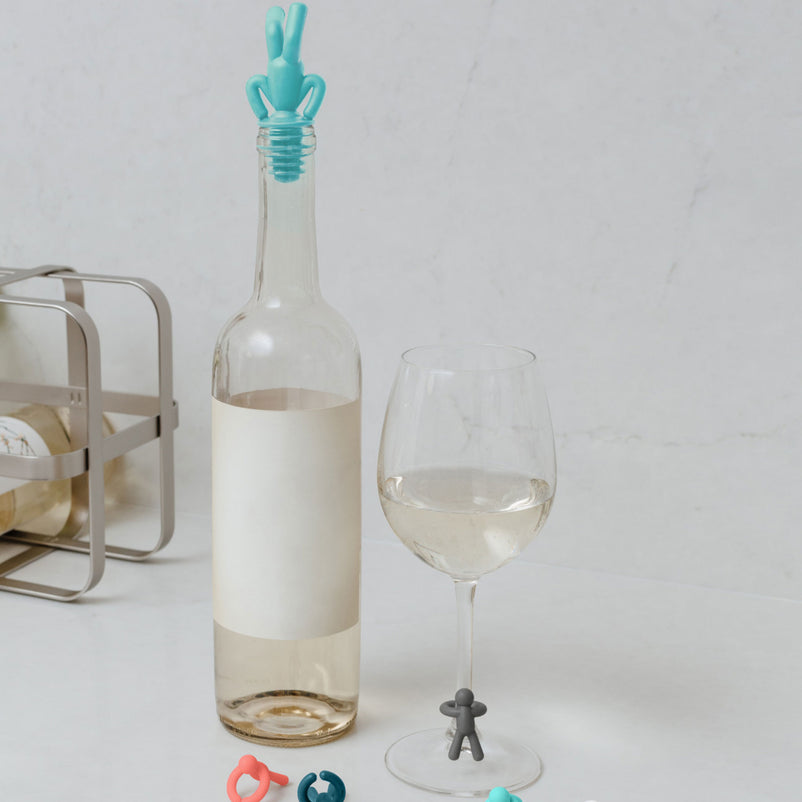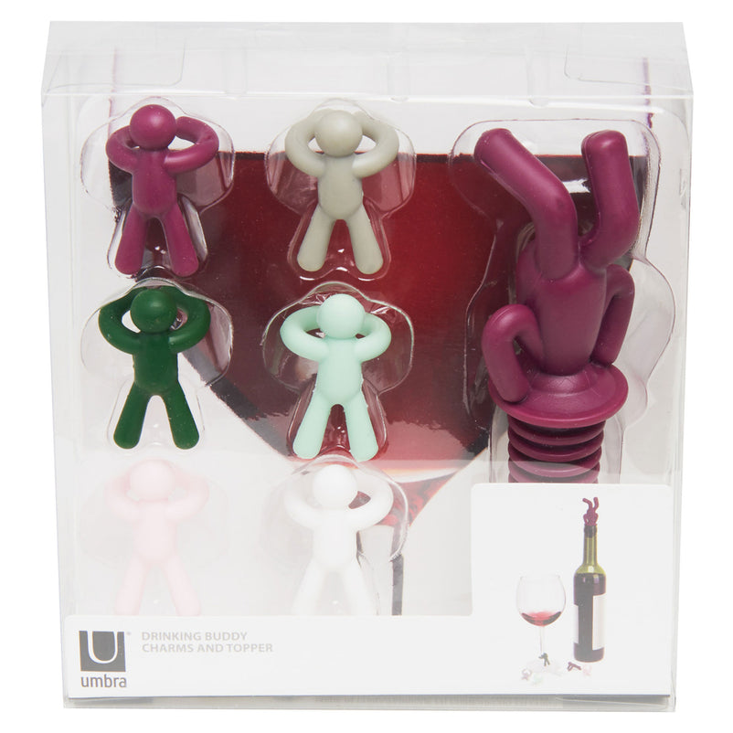 Set dop sticlă și 6 ornamente pahare. Setul din gama Buddy surprinde prin modelul jovial și completează practic colecția voastră de accesorii. Dopul este special proiectat pentru păstrarea calității după desfacere a șampaniei sau a vinului, iar ornamentele contribuie la identificarea și personalizarea paharelor.