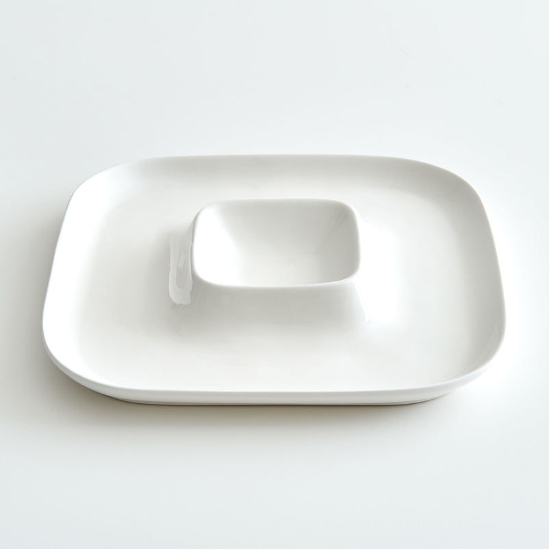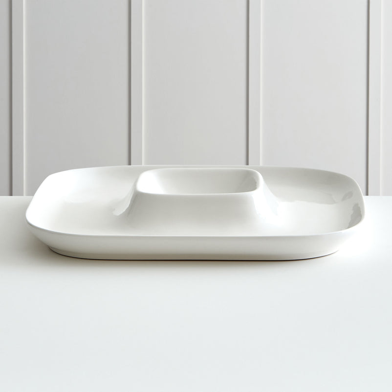Platou de servire aperitiv nachos, porțelan Plato. Platoul Plato este o piesă utilă în timpul servirii aperitivelor în zona de dining. Platoul este realizat din porțelan și este prevăzut cu două compartimente care oferă posibilitatea de a servi nachos și sos.