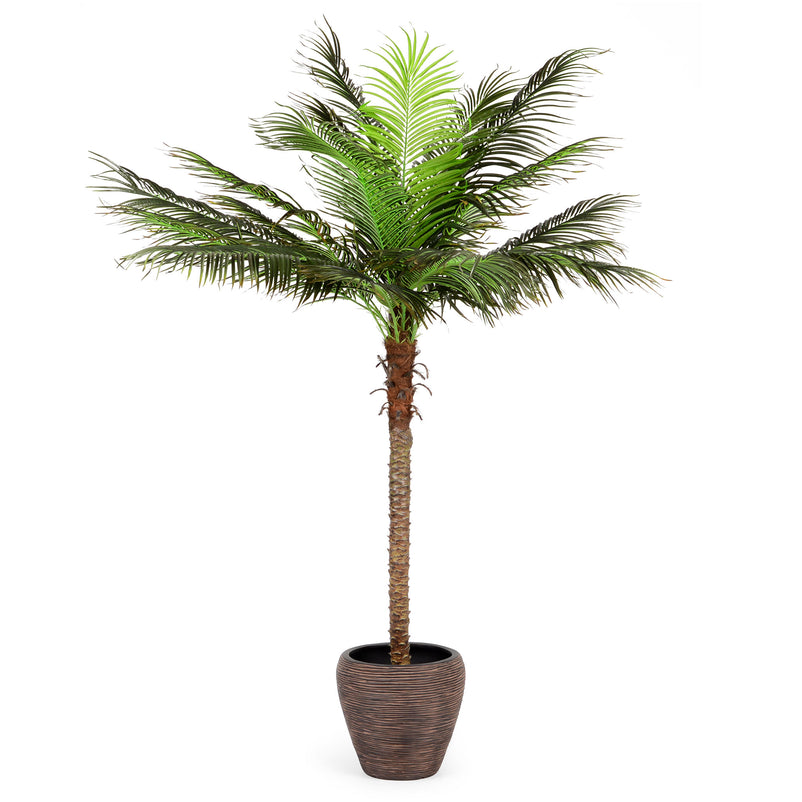 Copac artificial în ghiveci plastic Phoenix Palm. Adăugați un plus în decorul de acasă cu un copac artificial, care să aducă mereu aminte de un colț de natură. Copacul nu necesită îngrijire specială, astfel că este potrivit și pentru persoanele cu o agendă încărcată. Copacul este prezentat într-un ghiveci cu un model elegant, care se va potrivi cu ideea pentru amenajarea camerei. Ghiveciul ceramic din prezentare nu este inclus în preț, copacul vine într-un ghiveci din plastic, de culoare neagră.