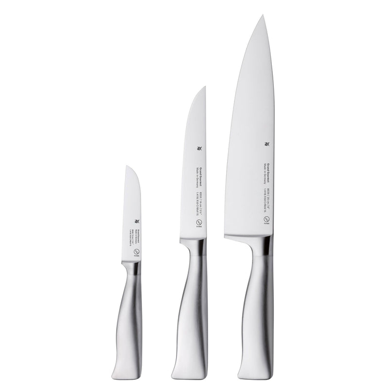 Set 3 cuțite Grand Gourmet. Completați setul de tacâmuri din bucătăria voastră cu cele trei cuțite din setul Grand Gourmet. Cuțitele Grand Gourmet au fost realizate cu măiestrie, în cele mai bune condiții. După forjare, lamele intră într-un cuptor special pentru tratarea la căldură. Beneficiul: structura materială a lamei se schimbă, ceea ce face ca oțelul să devină mai dur astfel încât să poată fi slefuit la un unghi mai ascuțit. Pentru aceasta fiecare lamă este măsurată individual cu un laser pentru a determina unghiul optim de tăiere. Deosebit de practice și cu un aspect plăcut, cuțitele sunt ideale pentru a vă ajuta la gătit, având dimensiuni și lame diferite. În plus, au un design modern, oferind un plus de stil în spațiul vostru pentru gătit.