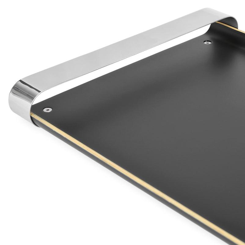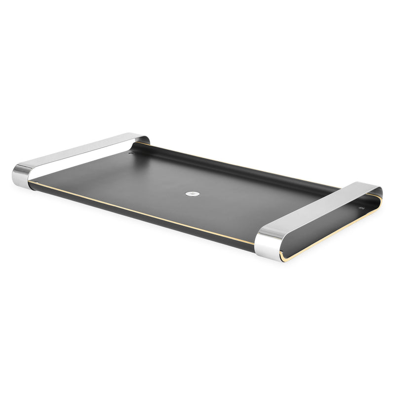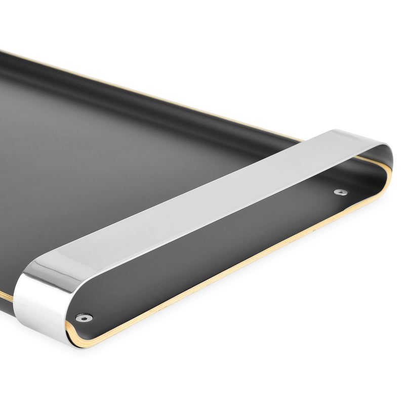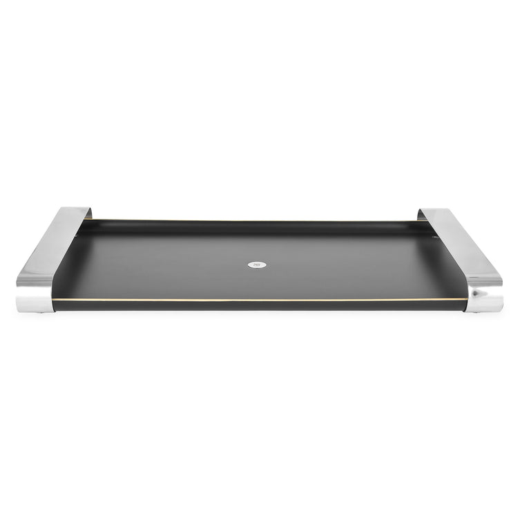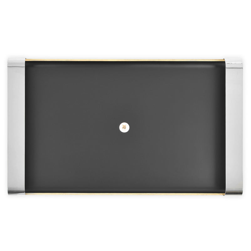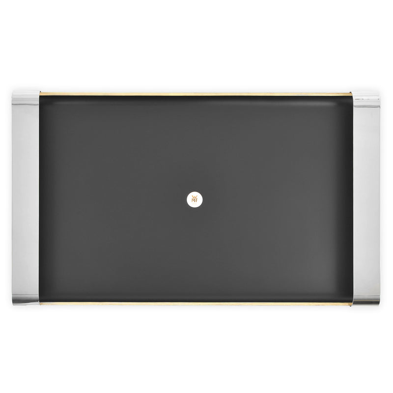 Tavă servire Club. Transformați experiența servirii într-una modernă, elegantă și exclusivistă adăugând în decorul culinar tava pentru servire din gama Club, realizată din cromargan, oțel inoxidabil, marcă înregistrată a calității germane, și lemn lăcuit negru. Combinația celor două materiale, împreună cu designul cu mânere rotunjite pe întreaga lățime și lipsa ramei, fac din piesa din gama Club o piesă deosebită care pune în valoare preparatele voastre cu spațiul generos și care îi impresionează pe cei de la masă.