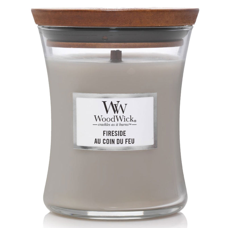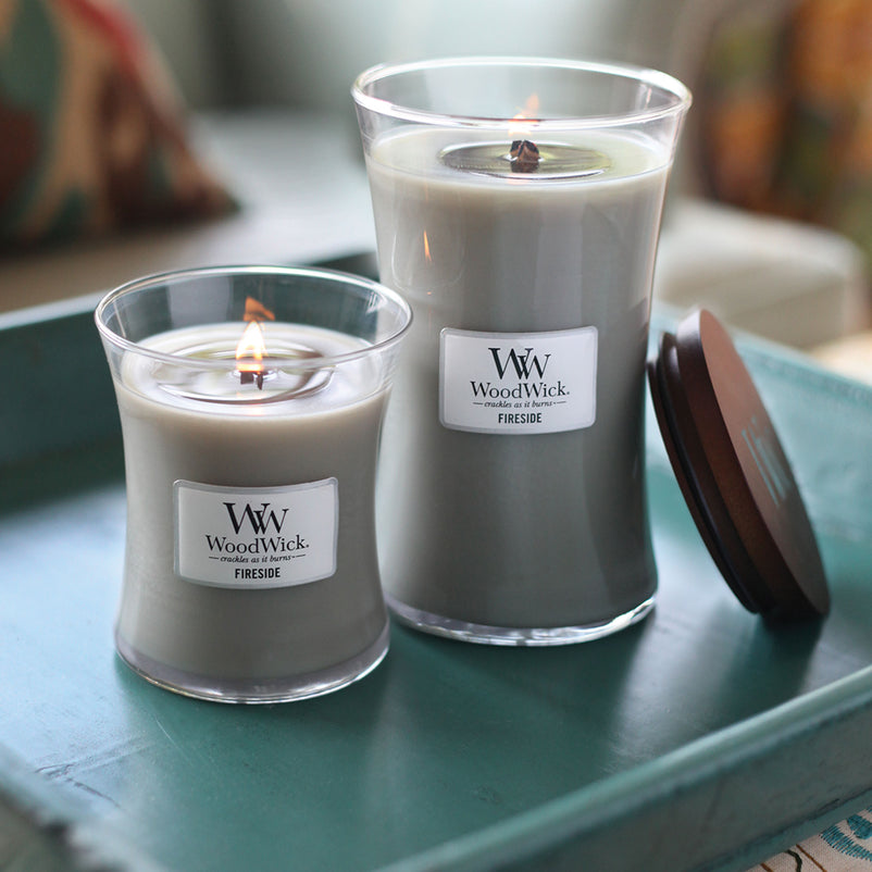 WoodWick Fireside - parfumul unei seri calde, petrecute lângă foc, redat de note de chihlimbar, vetiver și mosc.