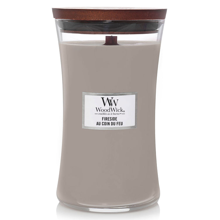 WoodWick Fireside - parfumul unei seri calde, petrecute lângă foc, redat de note de chihlimbar, vetiver și mosc.