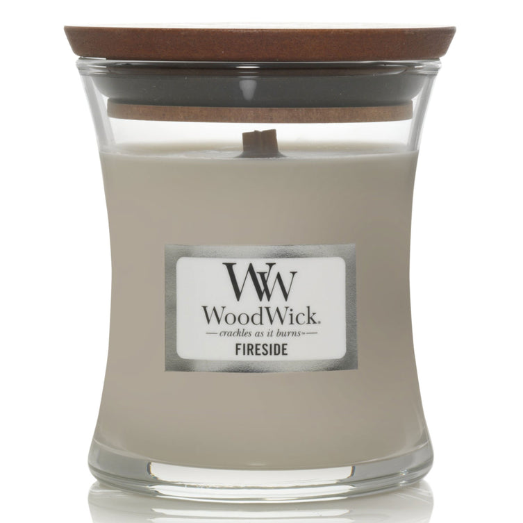 WoodWick Fireside - parfumul unei seri calde, petrecute lângă foc, redat de note de chihlimbar, vetiver și mosc.