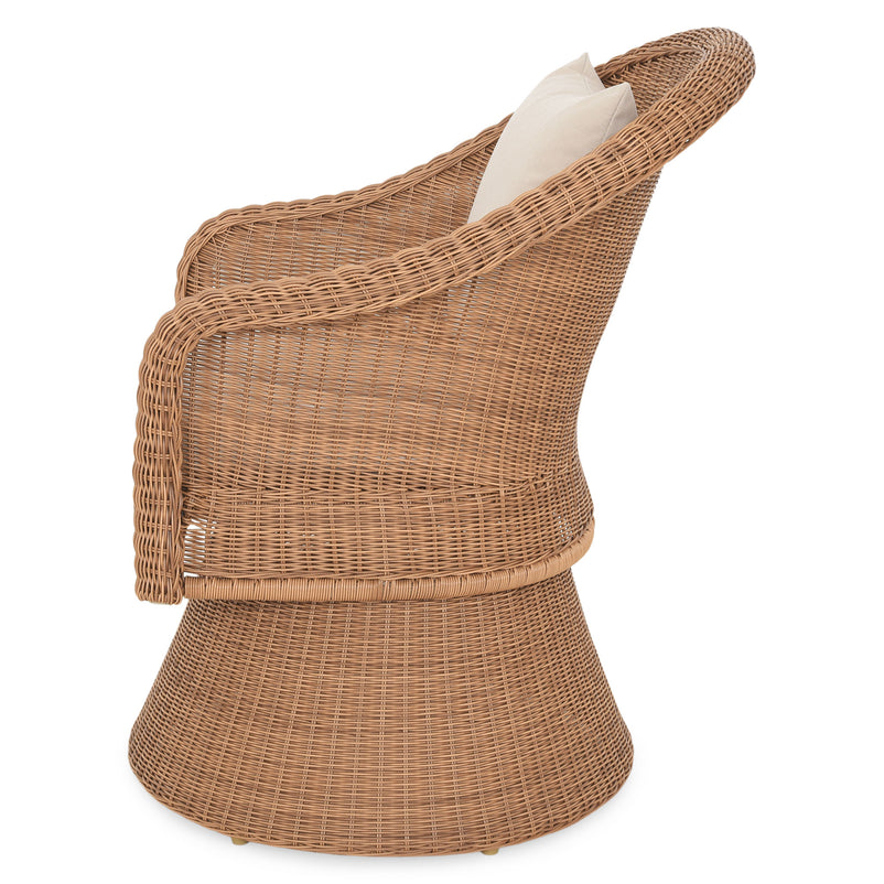Scaun rotativ exterior Grappa. Mobilierul este realizat din structura de aluminiu vopsita in camp electrostatic si impletita manual cu fibre sintetice tratate UV. Husele pernelor sunt confectionate din fibre sintetice impermeabile si tratate UV, fiind prevazute cu fermoar pentru a fi mai usor de indepartat si curatat.
