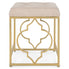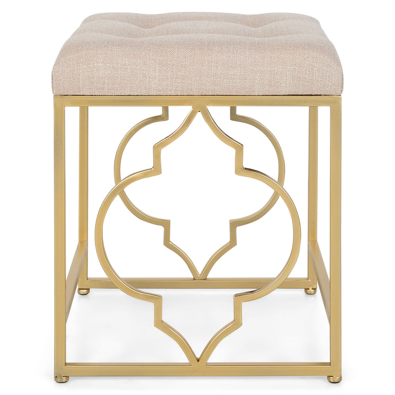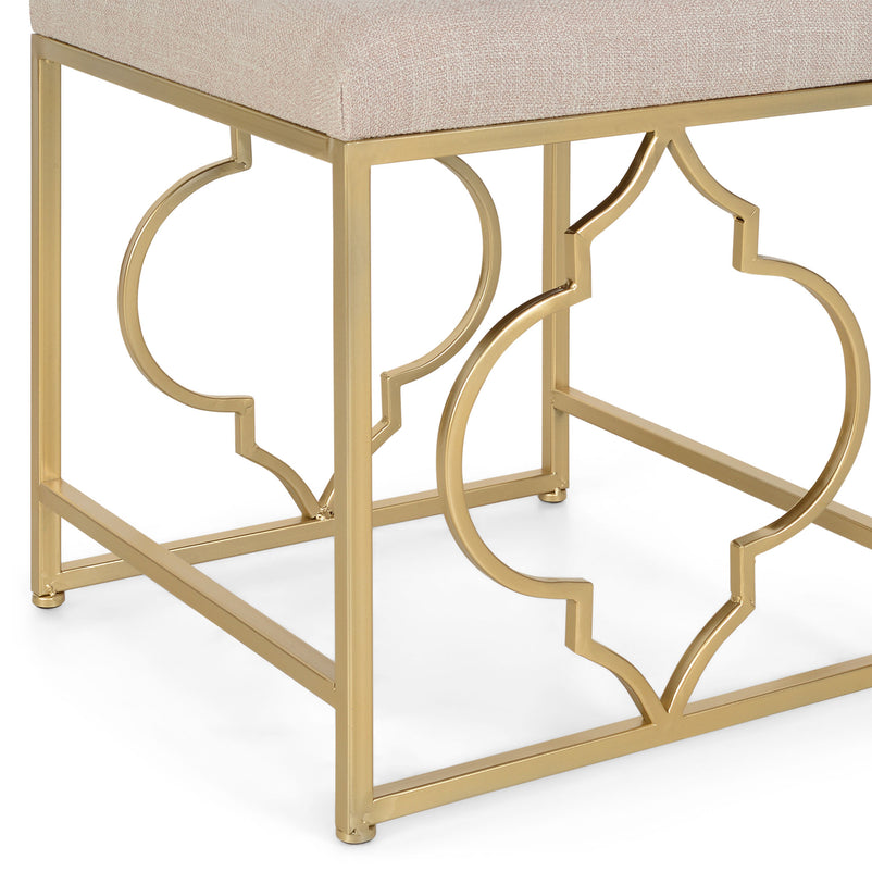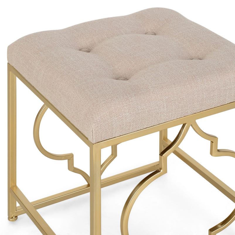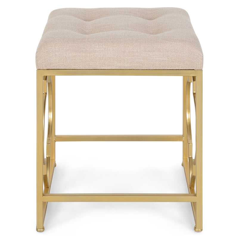 Taburet, stofă Paco. Rafinament și eleganță cu taburetul din gama Paco. Potrivit pentru dormitor, în fața măsuței de toaletă sau în fața oglinzii, taburetul va fi locul vostru special. Taburetul are un șezut pufos, moale, tapițat în stofă, cu detalii subtile, pentru clipe de confort și relaxare. Designul prețios este completat de structura metalică, cu un finisaj auriu. Structura are un model geometric, care imprimă un stil și mai distins, accentuând caracteristicile deosebite ale piesei de mobilier.