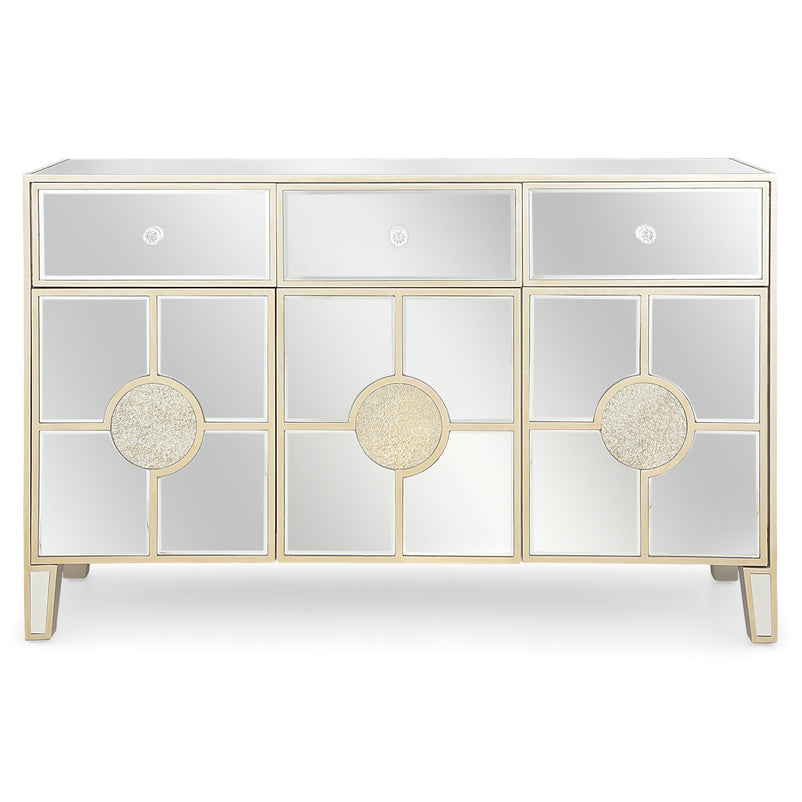 Comodă 3 sertare, 3 uși Mirror. Luxuriant și nobil. Acestea sunt caracteristicile care recomandă produsul, pentru o mobilare rafinată. Comoda este o variantă de o eleganță superioară, cu un aspect de oglindă și detalii aurii distinse, care îmbracă funcționalitatea piesei de mobilier. Ideală pentru un dormitor de lux sau un living impresionant. Latura practică nu este neglijată, comoda oferind un spațiu generos pentru a depozita lucrurile de care aveți nevoie, cu 3 sertare și 3 uși.