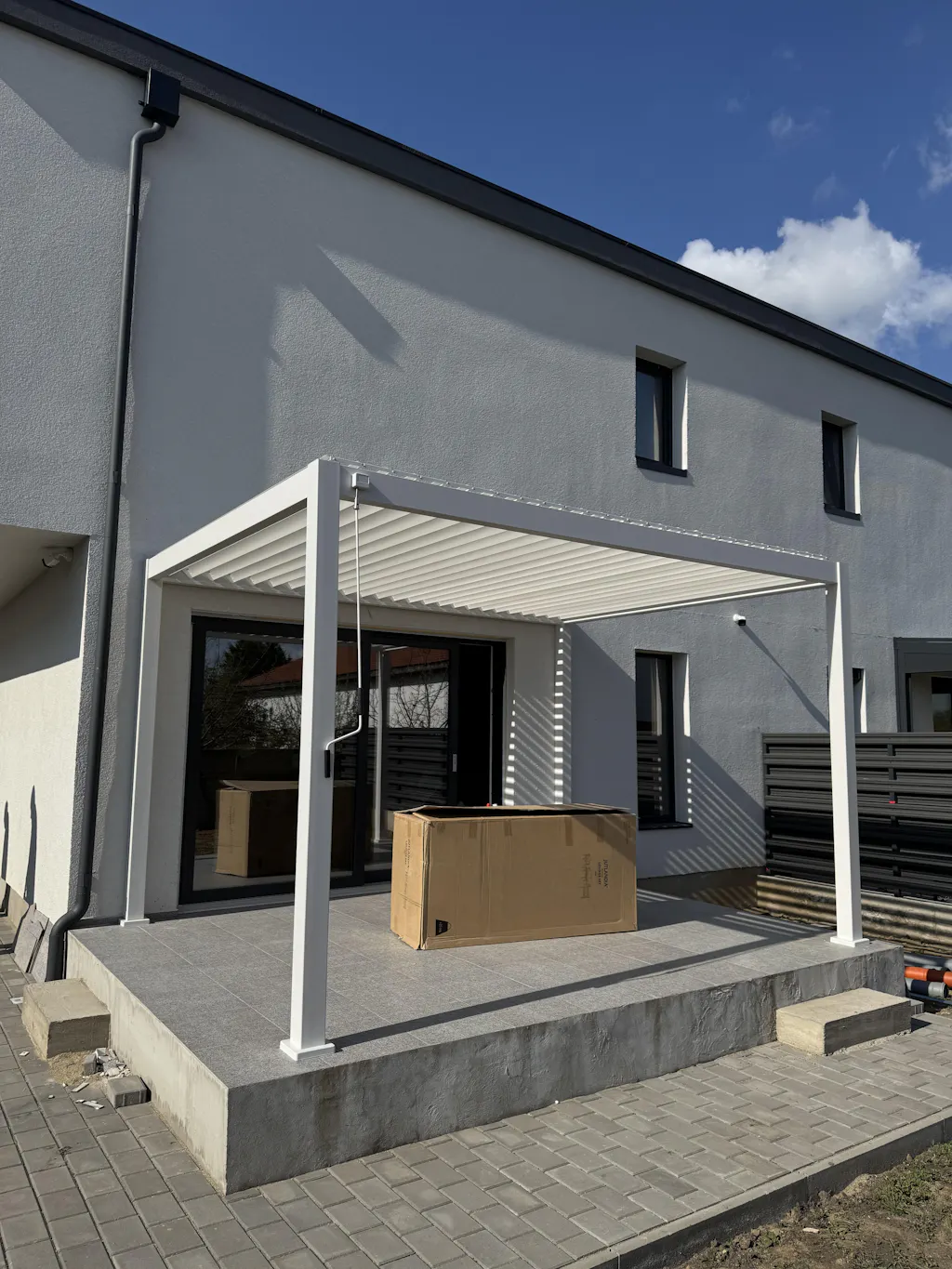 Pavilion Mirador Gold. Pavilionul Mirador Gold este un accesoriu perfect pentru orice terasă sau grădină, grație funcționalității sale. Fie că vă doriți un spațiu unde de relaxare în voie, fie că vreți ca petrecerile să nu fie întrerupte de ploaie, pavilionul Mirador Gold va contribui armonios la amenajarea spațiului exterior. Pavilionul Mirador Gold este un acoperiș din panouri de oțel galvanizat cu cameră de aer ce se rabatează de-a lungul ghidajelor de oțel. Structura acestuia este confecționată din aluminiu Tiger, vopsită în câmp electrostatic, oferindu-i rezistență și durabilitate. Lamelele din oțel galvanizat sun pliabile și accesorizate cu cameră de aer care în momentul extinderii acesteia se creează un efect de etanșeitate, acoperind întreaga terasă. Rezistența sa permite un debit de apă de până la 5L/minut și 25 kg/ lamela în cazul zăpezii, recomandându-se să păstrați lamelele în poziția deschis pe timpul unei zăpezi puternice. Fiecare stâlp al pavilionului are un sistem pluvial de colectare a apei ce vă ajută în zilele ploioase. Simplă de asamblat și ușor de operat, pavilionul Mirador Gold vă prelungește sezonul în aer liber.